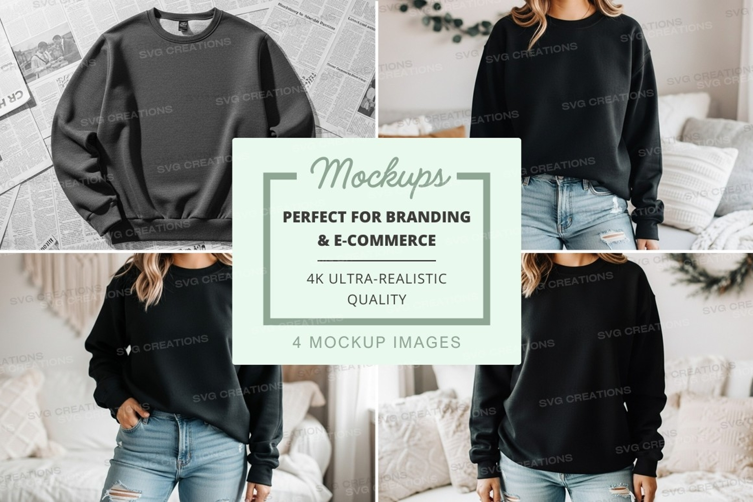 Black Mockup Jeans Sweatshirt Crew Neck Oversized Casual Wear
