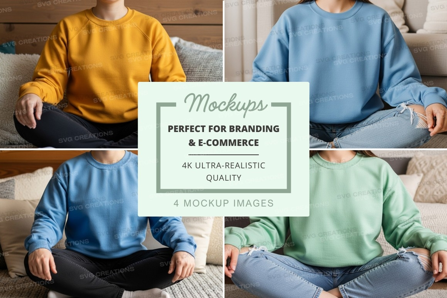 Mockup Light Blue Sky Blue Sweatshirt Mint Green Mustard Yellow Crew Neck Casual Wear Indoor Setting Relaxed Pose