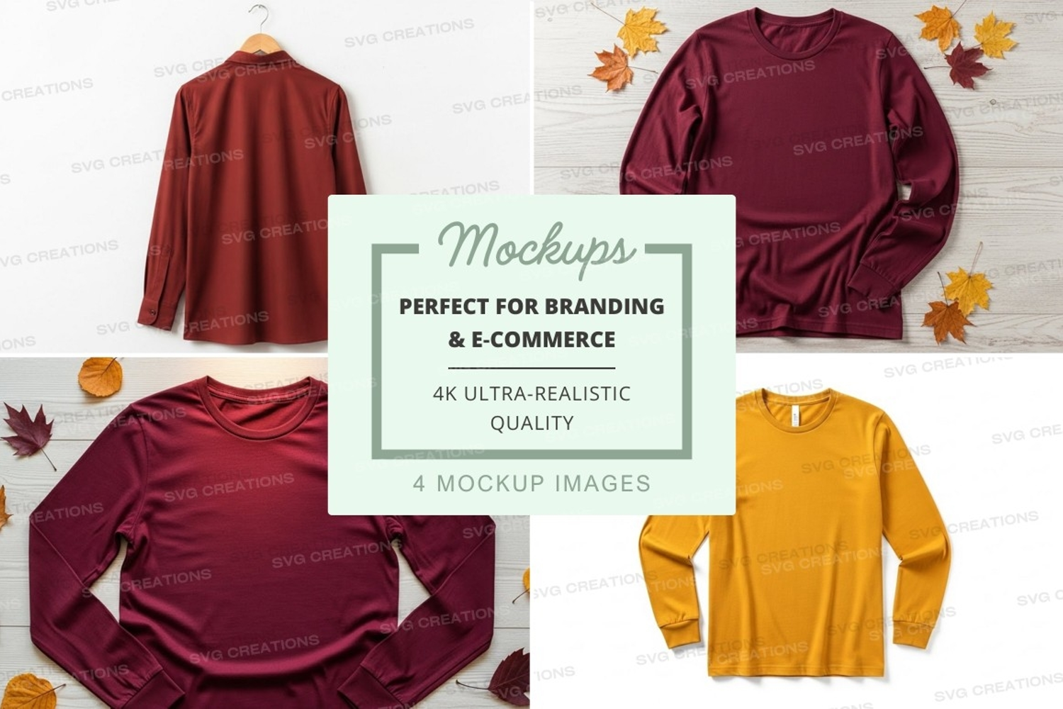 T-shirt Mockup Autumn Leaves Burgundy Maroon Long Sleeve Wooden Background Mustard Yellow