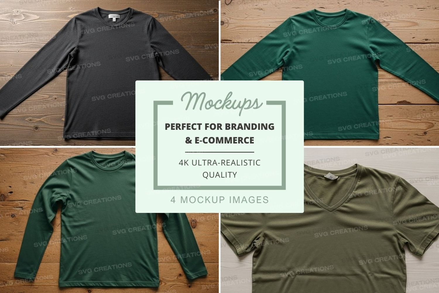 Black T-shirt Green Mockup Olive Wooden Background Long-sleeve Short-sleeve