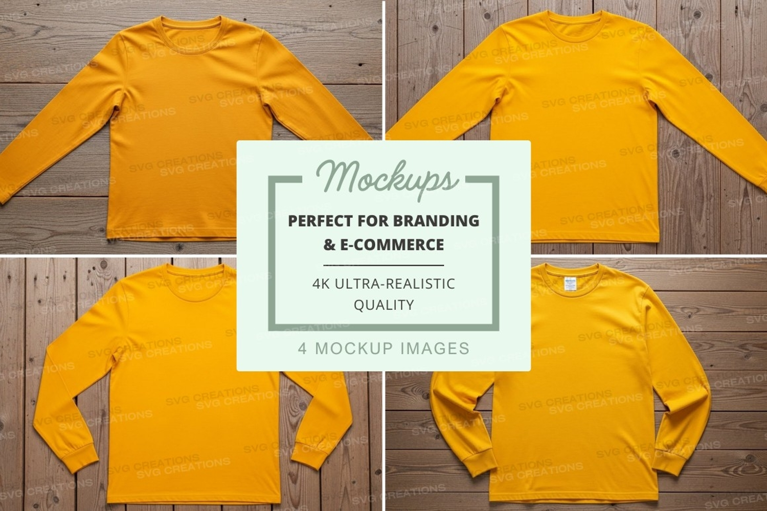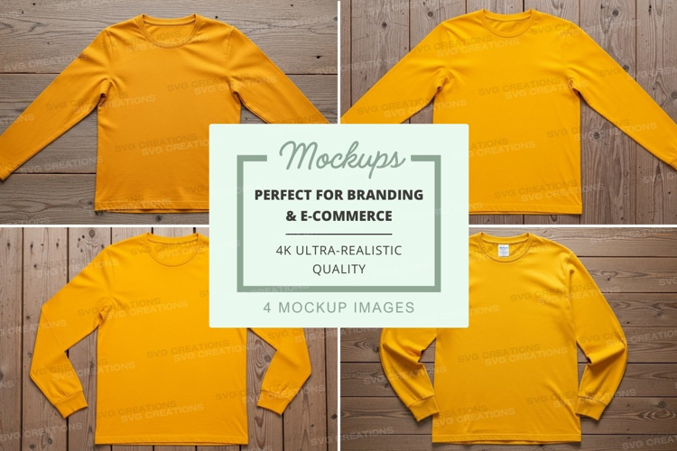 T-shirt Mockup Yellow Front View Side View Back View Shorts Long Sleeve Wooden Background