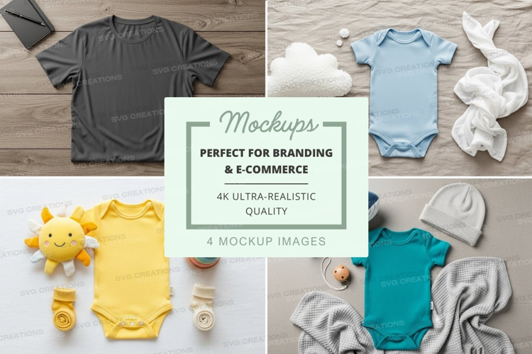 Mockup of baby onesies and adult t-shirt with accessories