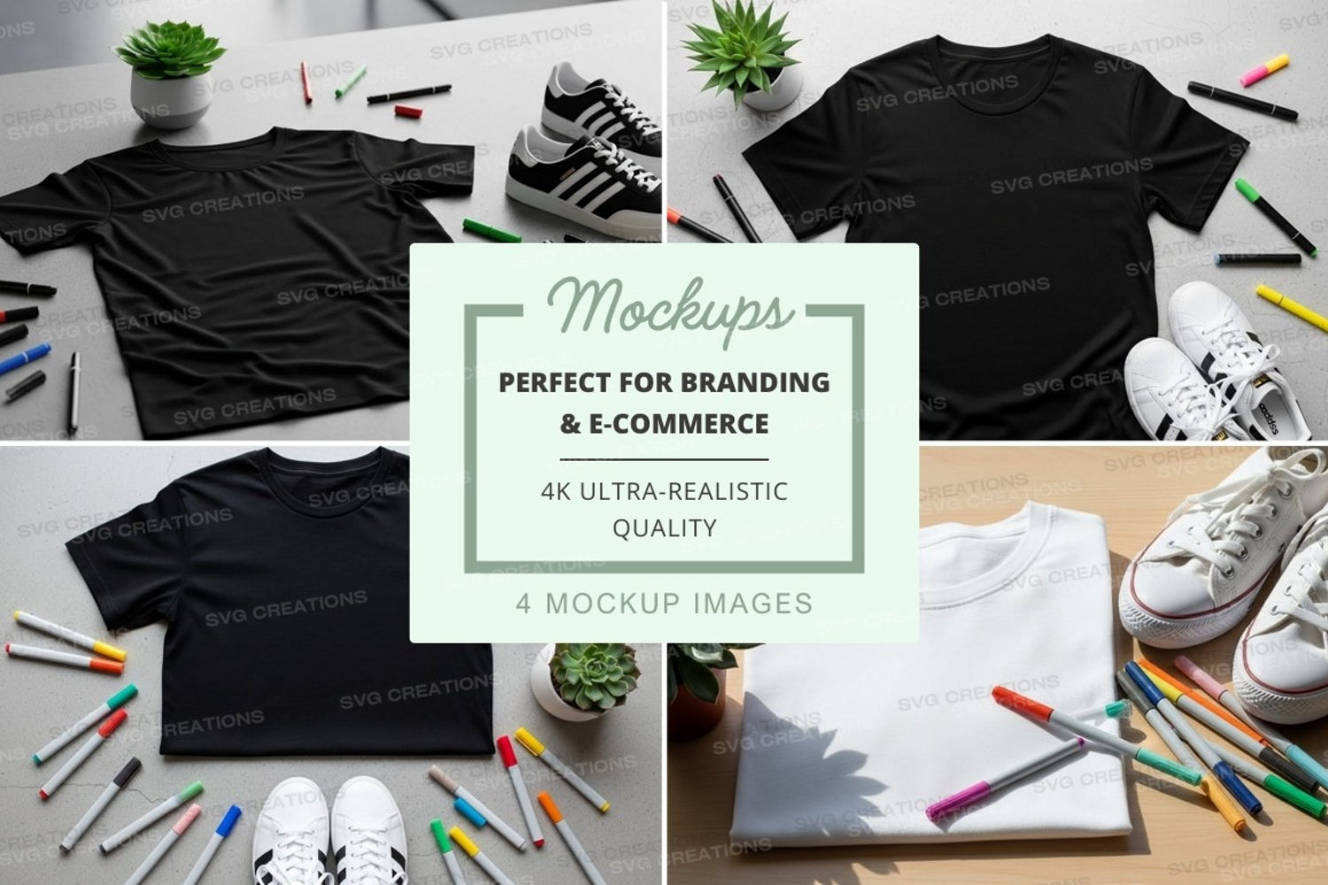 Markers Desk Plants Flat Lay Shoes Art Supplies T-shirt Mockup White T-shirt Black T-shirt