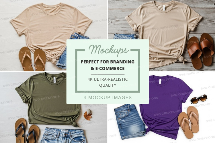 Fashion T-shirt Green Mockup Purple Beige Wooden Background Sandals Crew Neck Denim Shorts