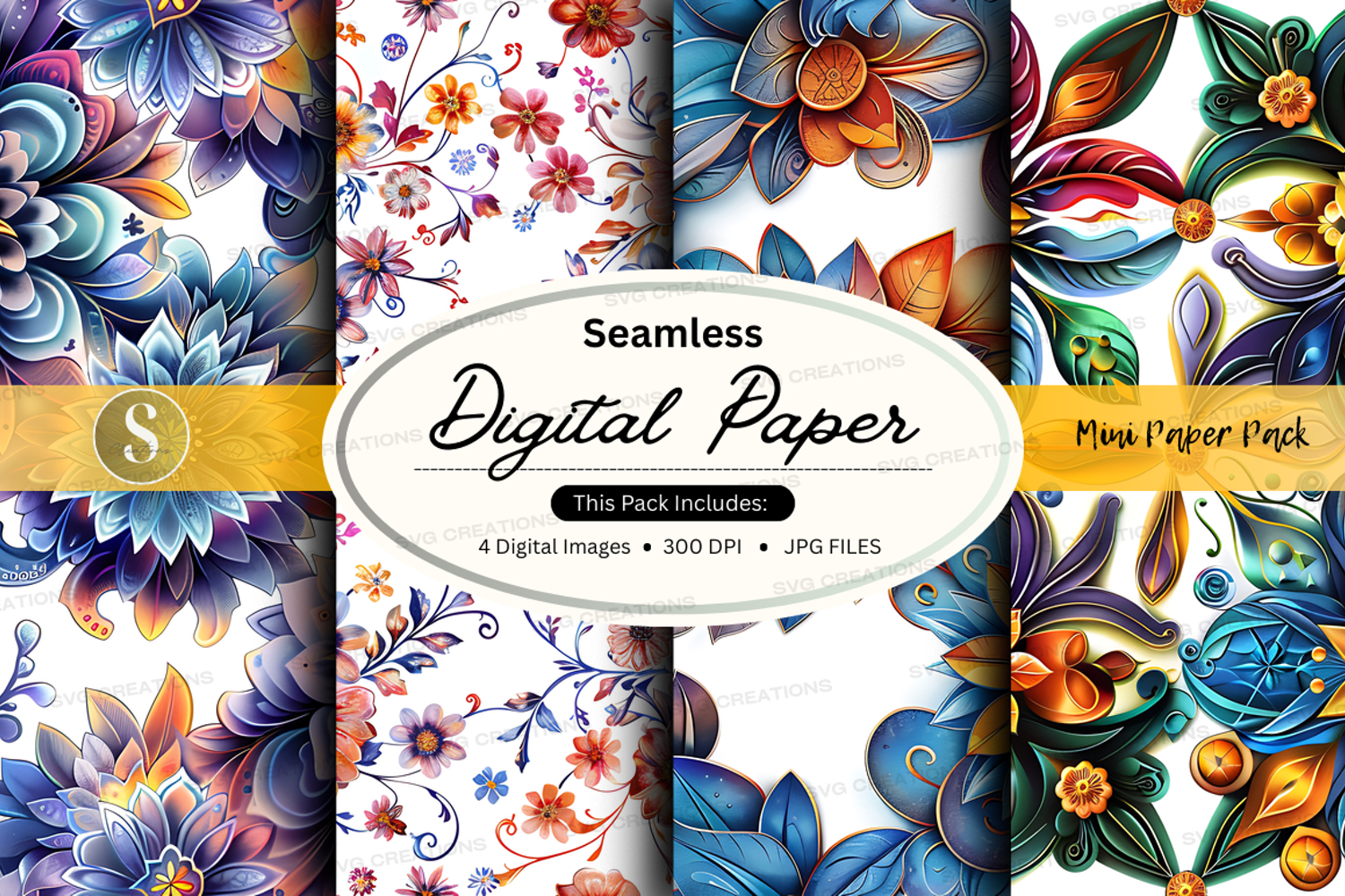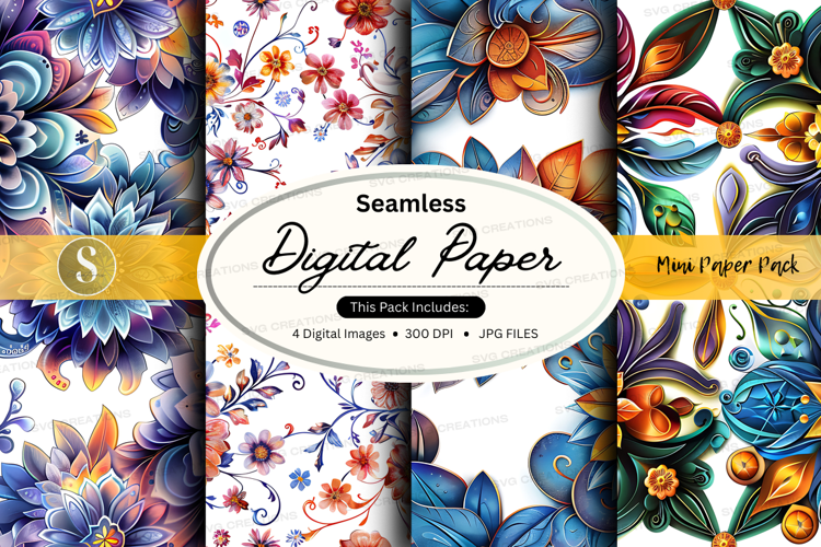 Digital Paper Floral Pattern 300 Dpi Vibrant Colors Seamless Design Jpeg Files Mini Paper Pack