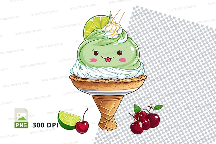 Illustration Cartoon Cute Fruits Ice Cream Cherry Cone Lime Whipped Cream