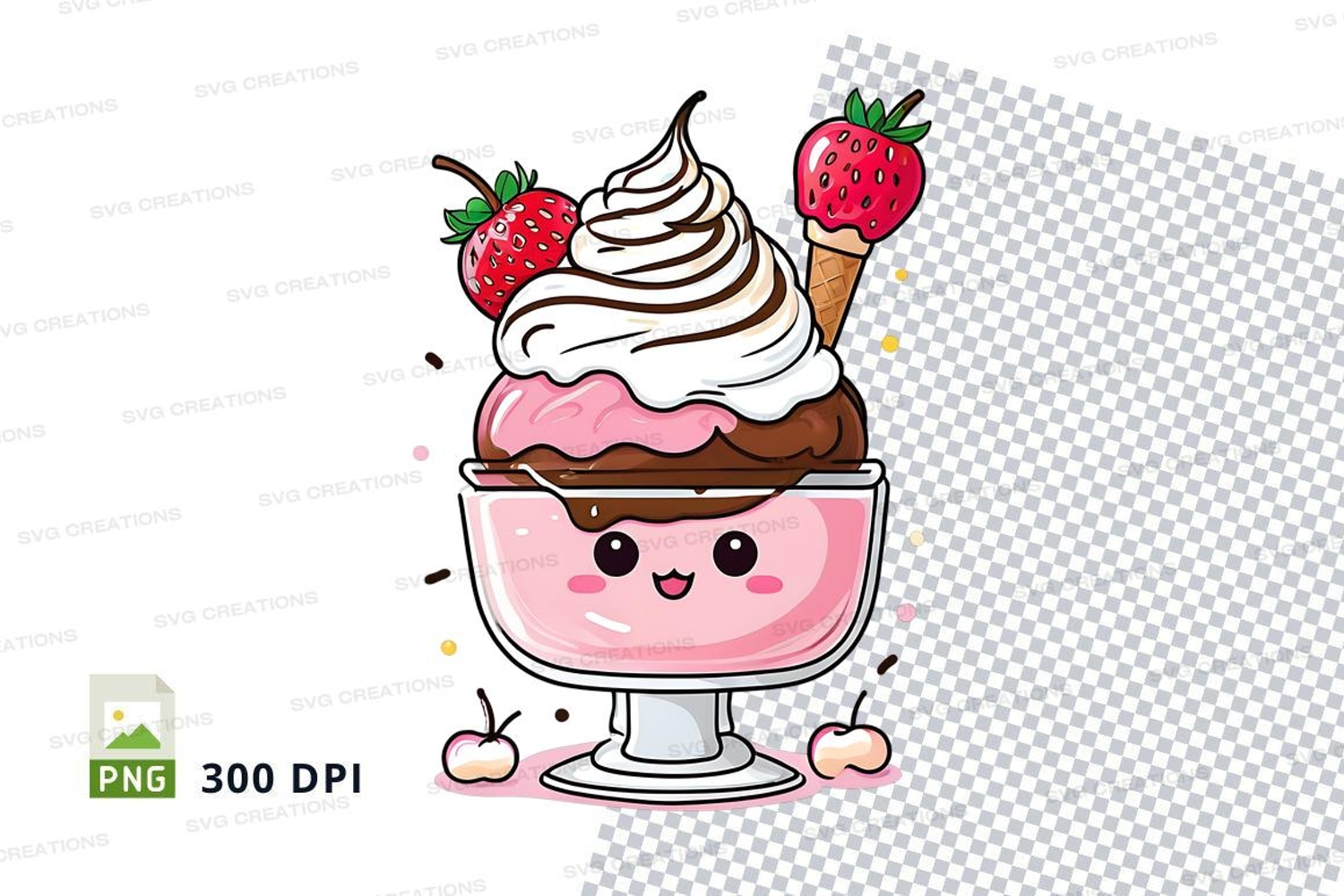 Illustration Cartoon Cute Clipart Strawberries Cherries Ice Cream Whipped Cream Sundae Chocolate Sauce