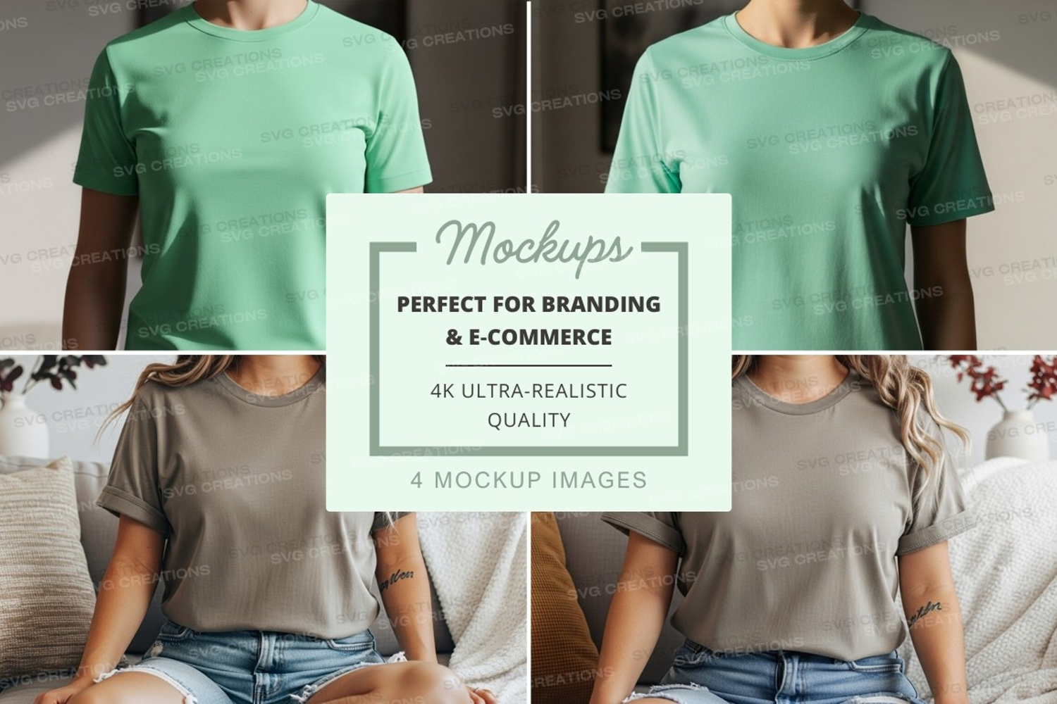 Couch Apparel Mockup Models T-shirt Mockup Neutral Background Gray T-shirt Light Green T-shirt