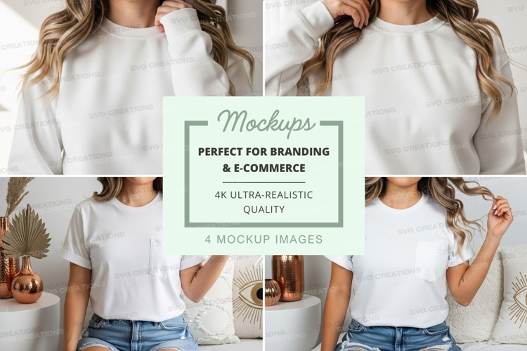 Collage Model Fashion Mockup Blue Jeans T-shirt Mockup White T-shirt Crew Neck Puffed Sleeves