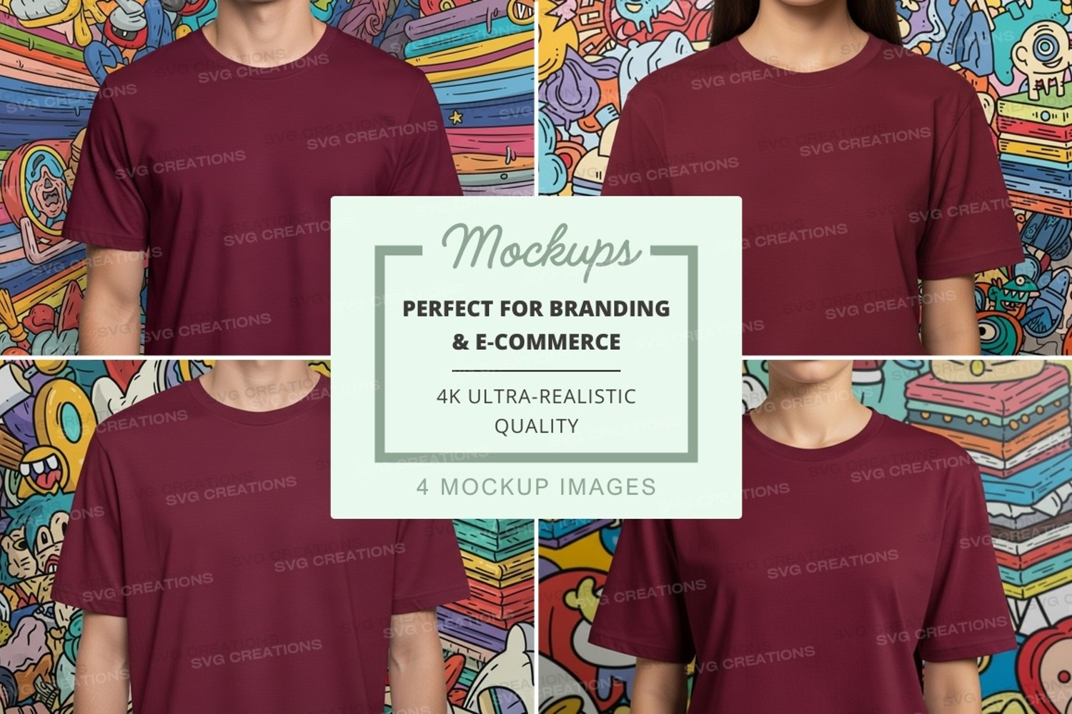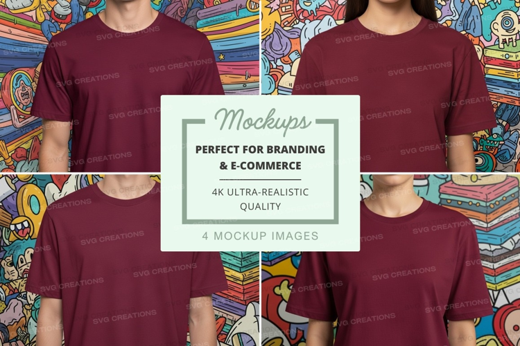 T-shirt Mockup Characters Books Maroon Colorful Background