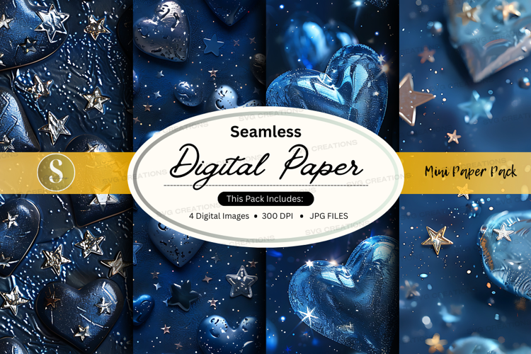 Hearts Golden Pattern Digital Background Stars Galaxy Seamless Digital Paper Dark Blue