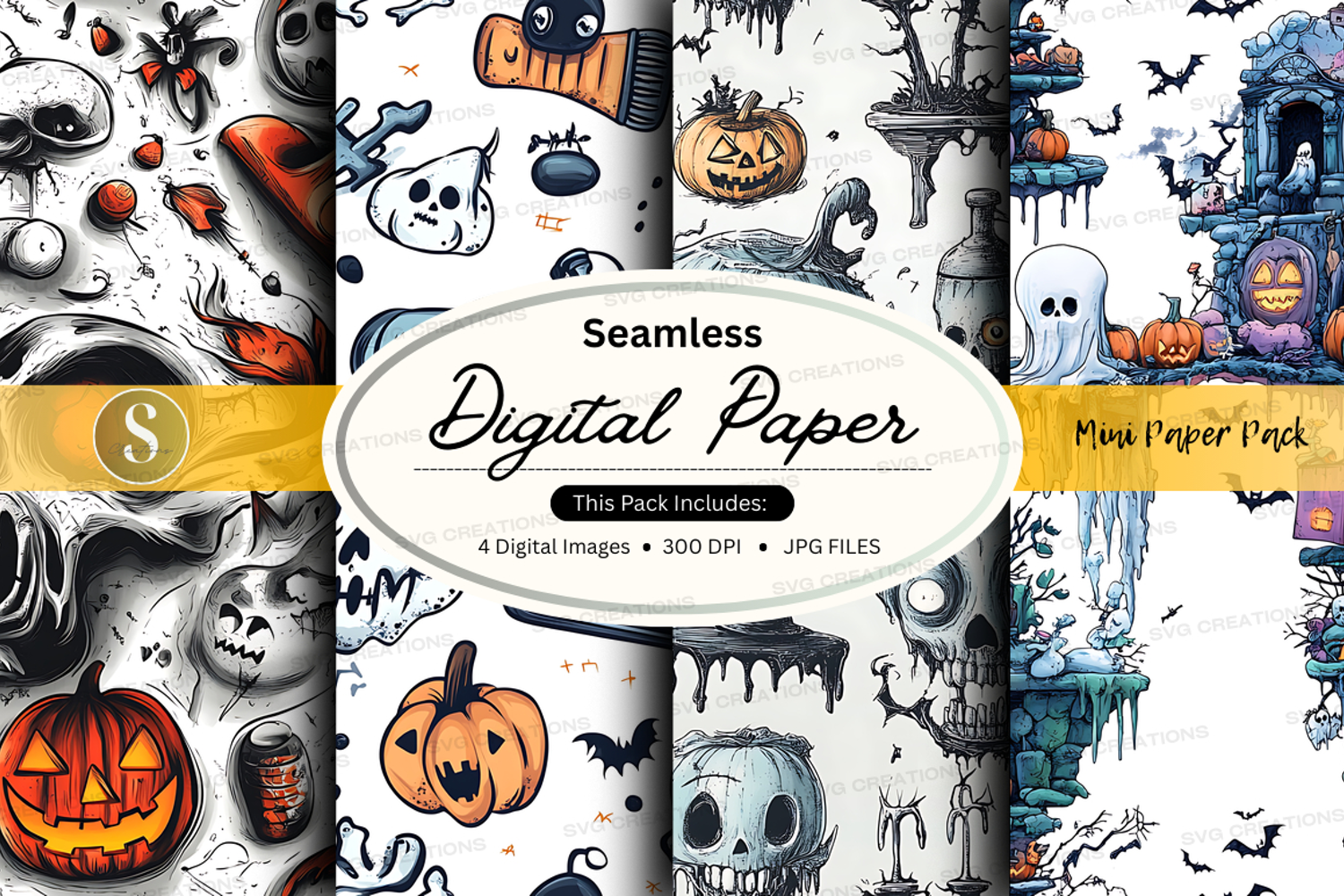 Halloween Skull Pattern Digital Paper Bat Seamless Ghost Pumpkin Jpeg 300 Dpi