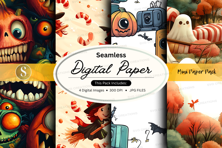 Illustration Halloween Digital Paper Seamless Spooky Ghost Candy Cane Skeleton Pumpkin Jpeg