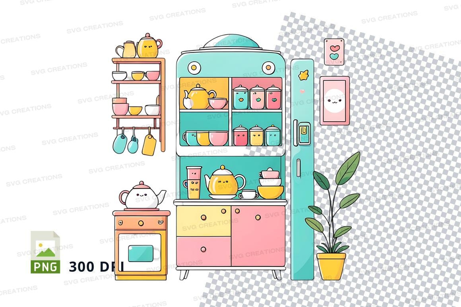 Illustration Clipart Plant Png Pastel Kitchen Teapot Jars Cups Cabinet