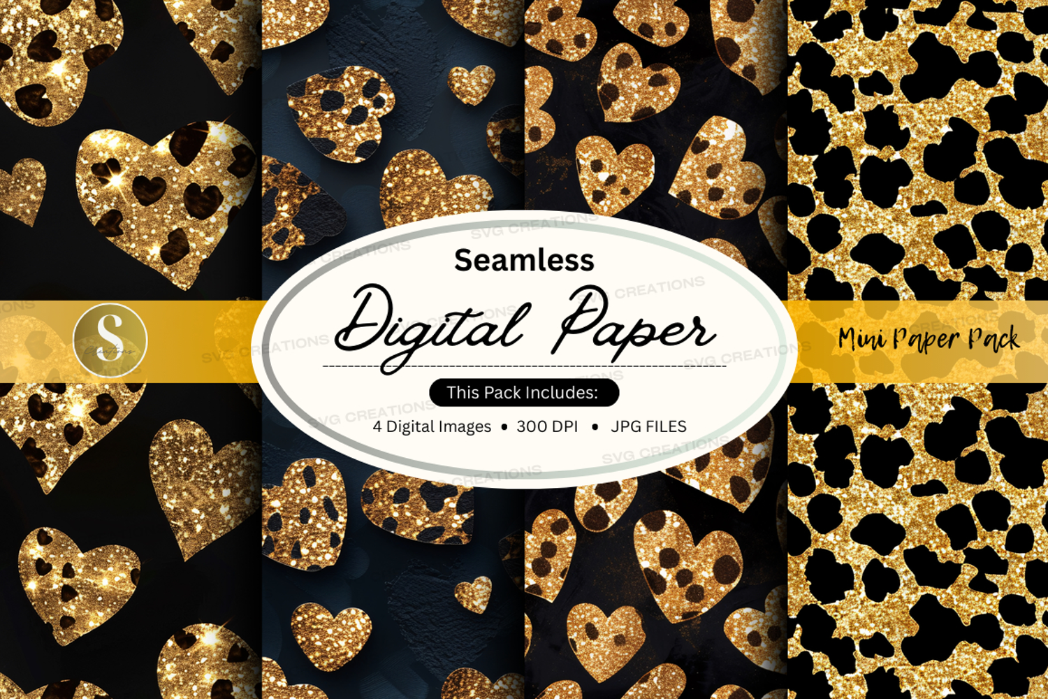 Digital Paper Seamless Pattern Leopard Print 300 Dpi Patterned Paper Digital Images Decorative Paper Dark Background Golden Hearts Jpeg Files