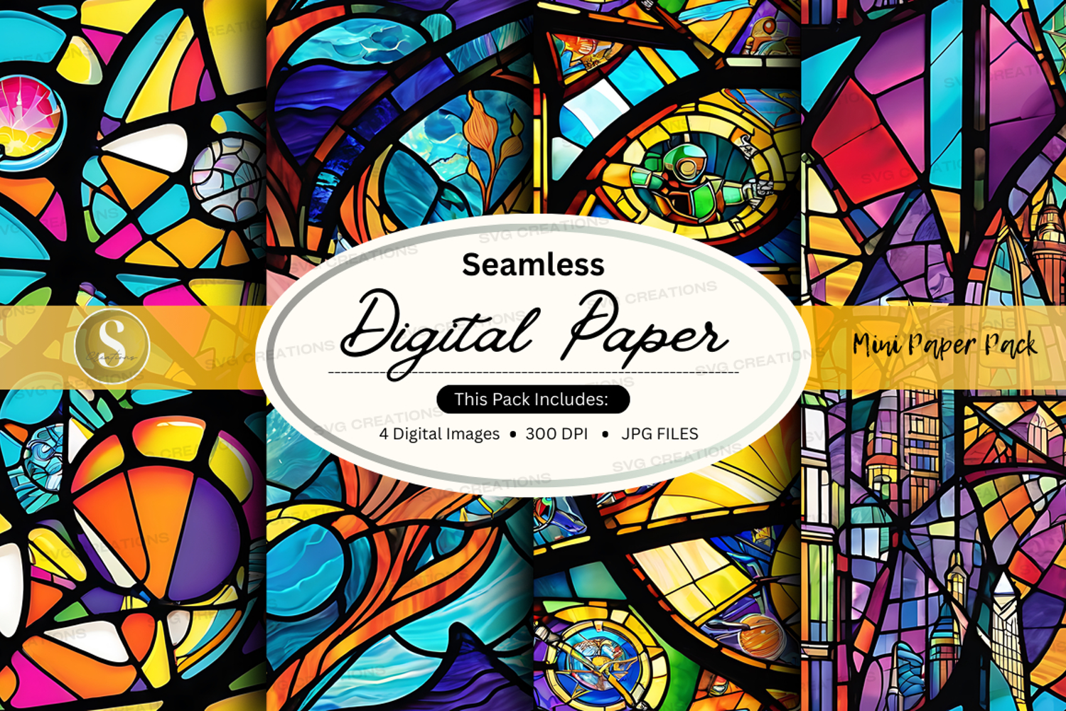 Seamless digital paper pack with vibrant stained glass patte