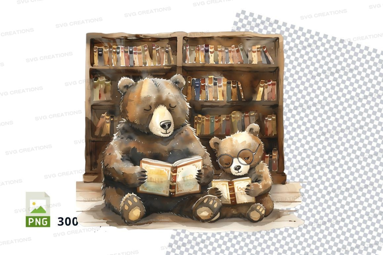 Similar Design Products to Brown teddy bears reading book in cozy library clipart