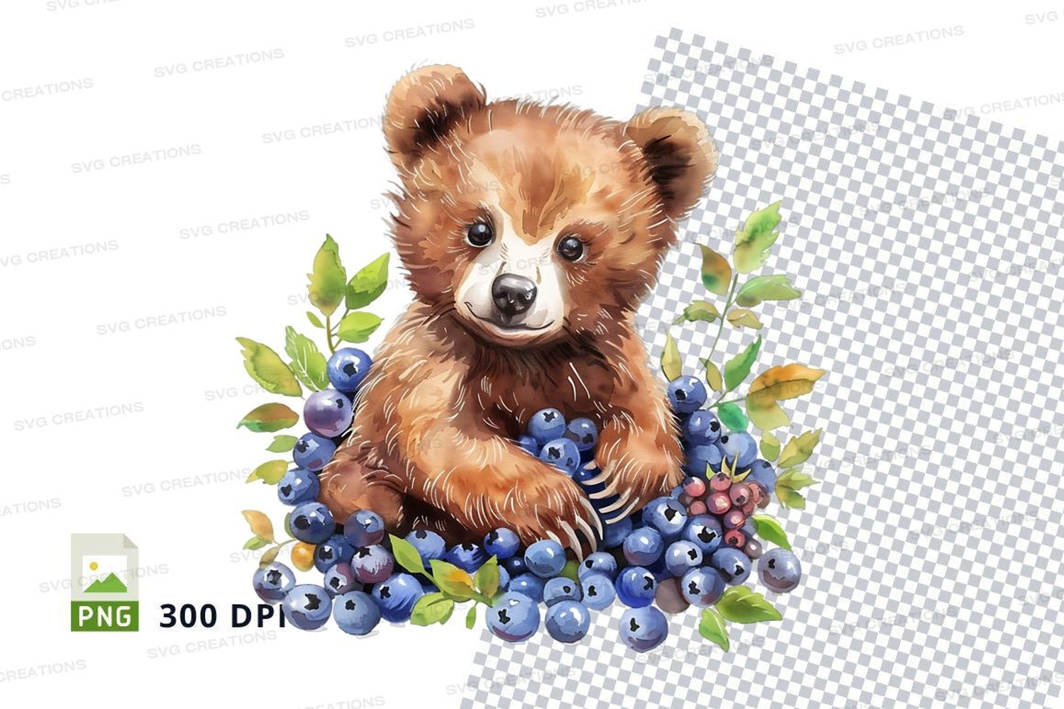 Similar Design Products to Cute brown bear cub holding blueberries clipart png