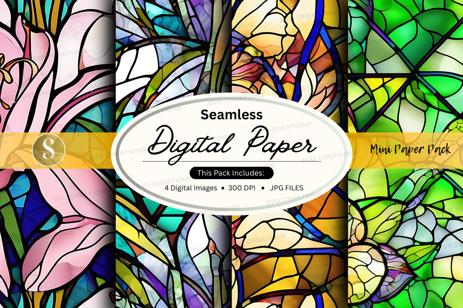 Seamless digital paper texture with vibrant stained glass pa