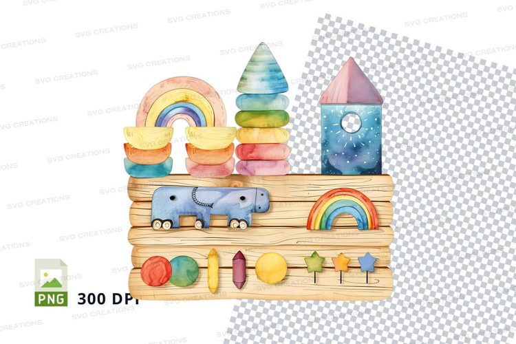 Colorful kids wooden toy box with rainbow and books clipart example image 1
