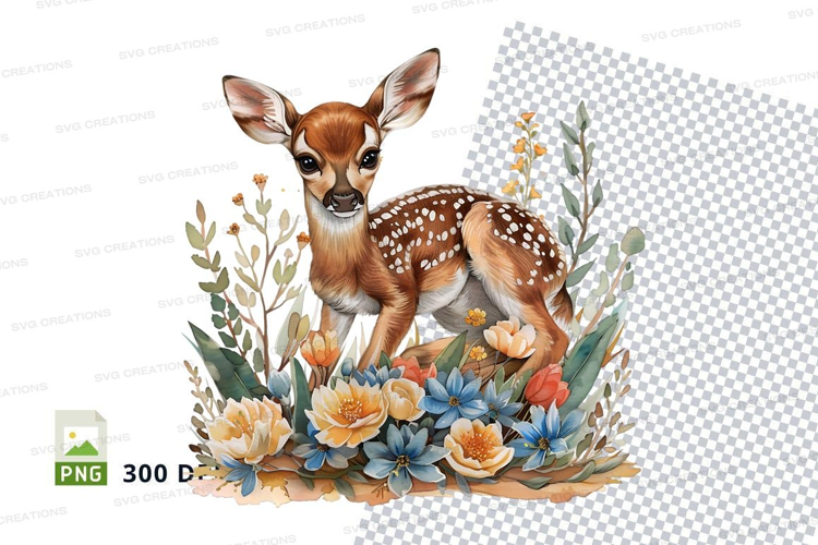 Cute baby deer fawn clipart in floral wreath watercolor PNG example image 1