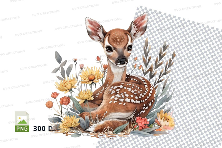 Cute baby deer clipart sitting in floral spring meadow water example image 1