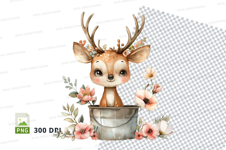 Cute deer clipart in floral bowl with pink flowers watercolo example image 1