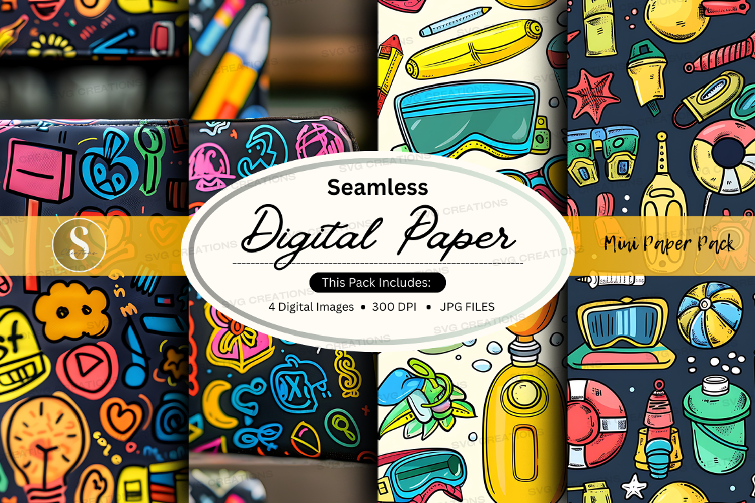 Seamless digital paper patterns with vibrant retro doodles a
