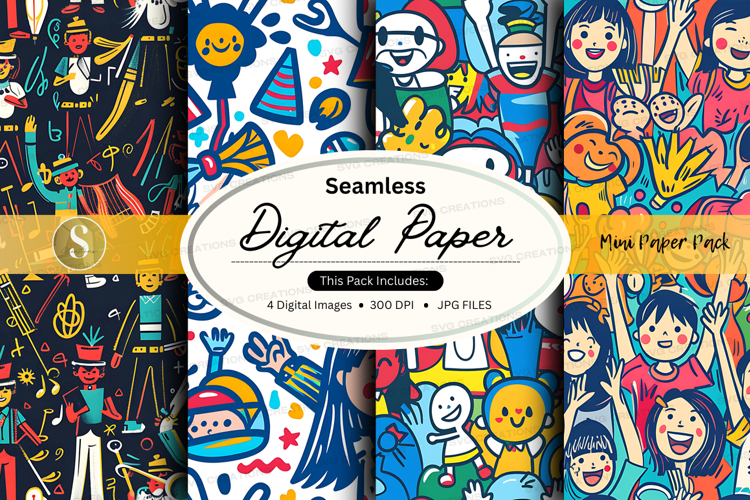 Seamless Digital Paper Pack with Cartoon Characters and Brig