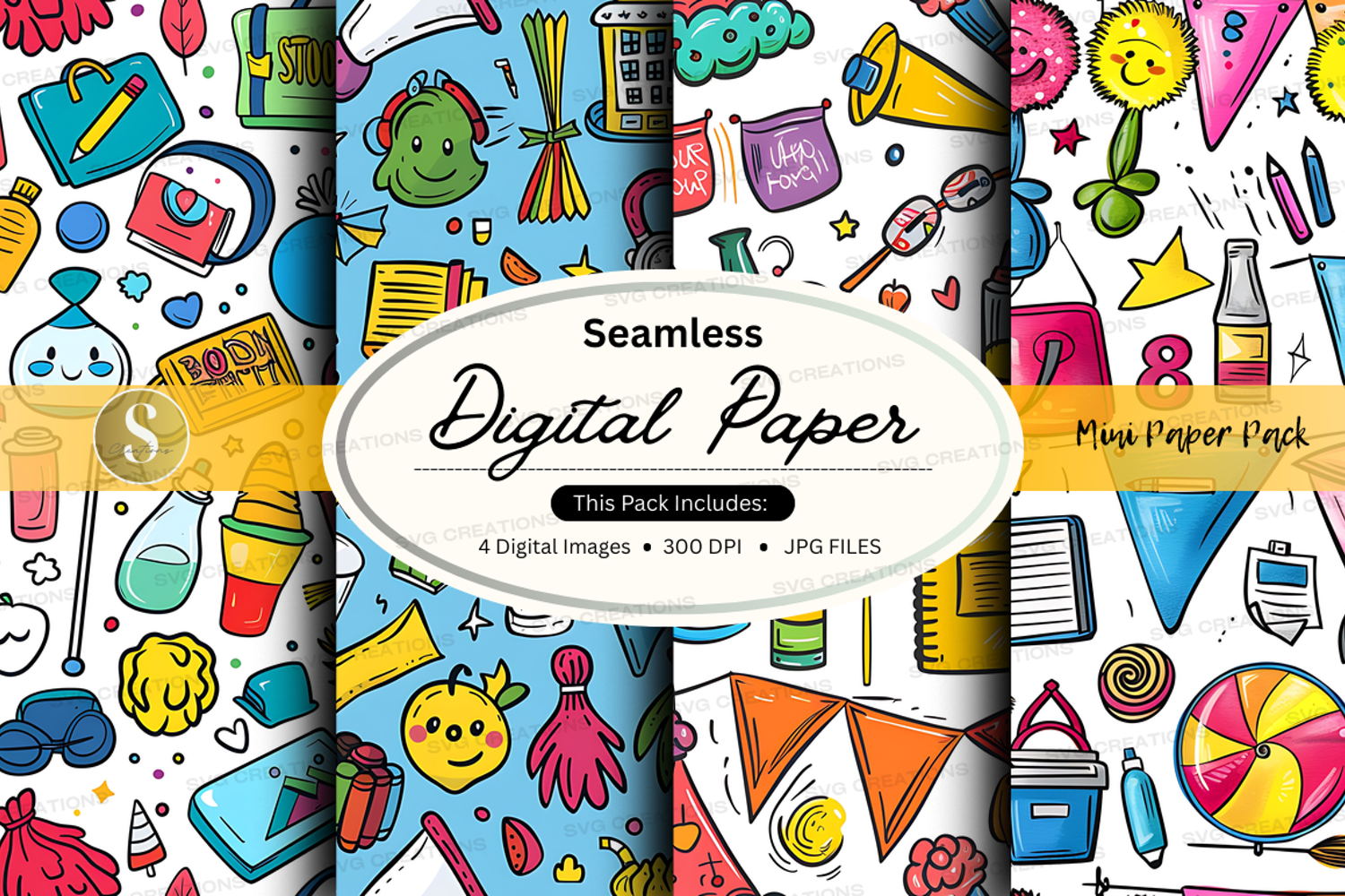 Seamless digital paper pack with colorful school and office
