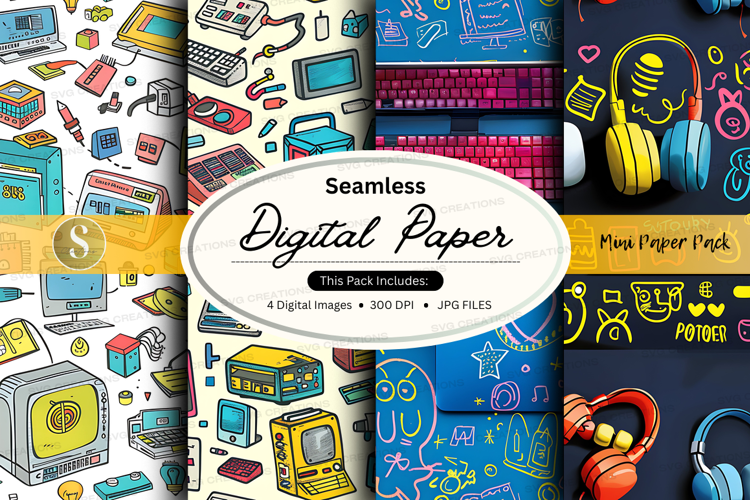 Similar Design Products to Seamless digital paper pack with retro tech icons and vibran