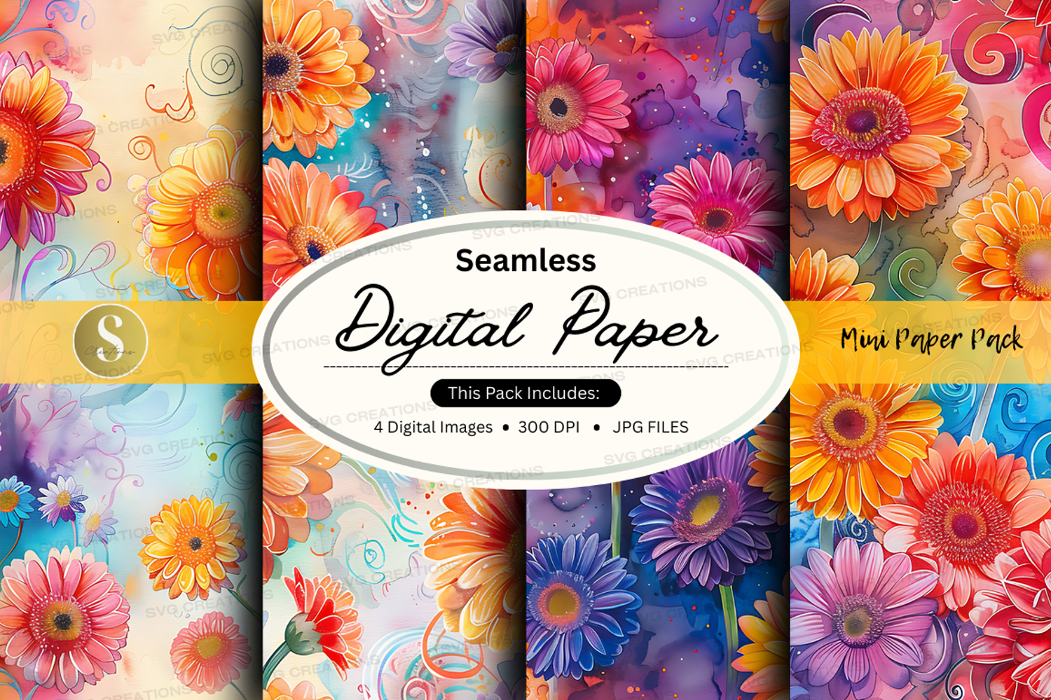 Seamless digital paper pack with vibrant floral patterns and example image 1