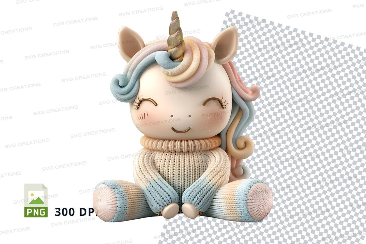 Similar Design Products to Cute unicorn plush toy sitting on white knit blanket clipart