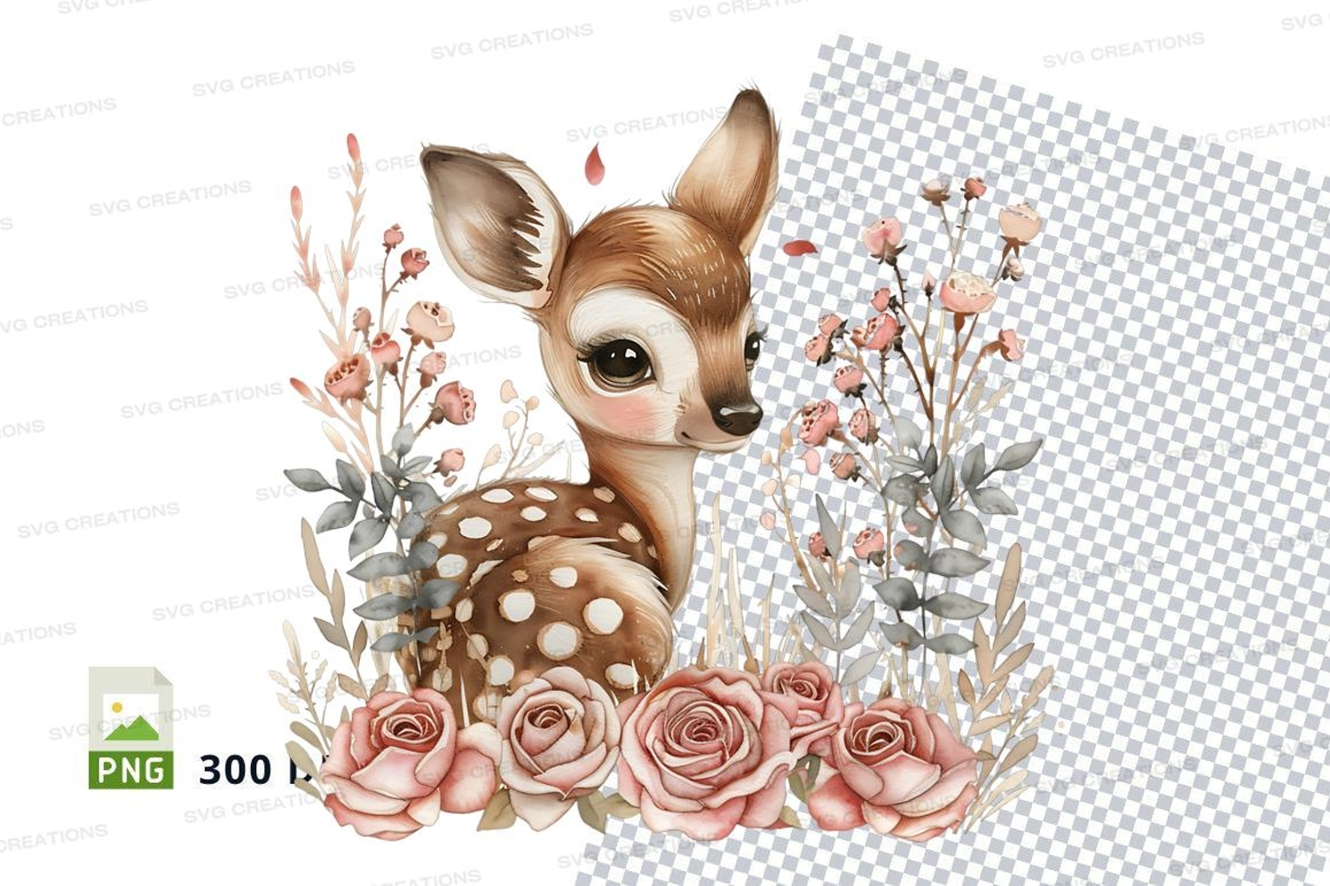 Similar Design Products to Cute fawn deer clipart in floral wreath with roses and polka