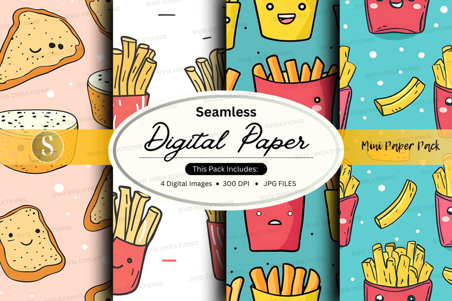 Food Paper Fast Digital Pattern Seamless Burger Fries Mustard Ketchup