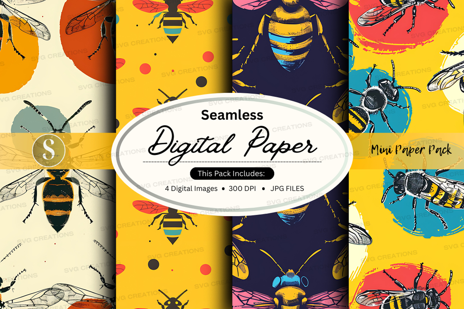 Seamless bee digital paper patterns yellow floral background example image 1