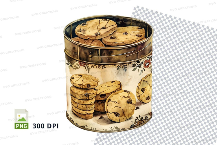 Vintage cookie tin with chocolate chip cookies clipart png example image 1