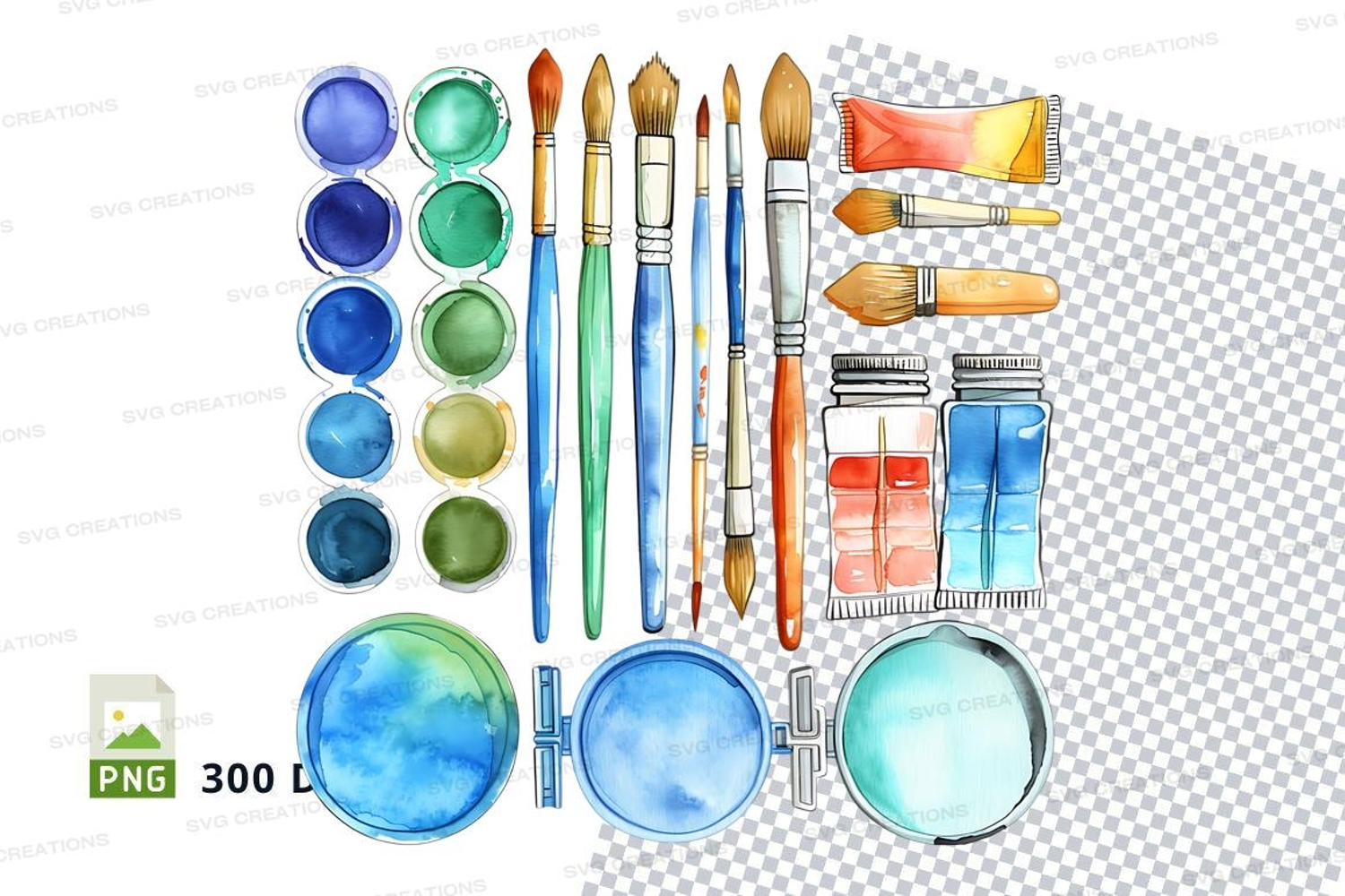 Watercolor paint set clipart transparent PNG art supplies example image 1