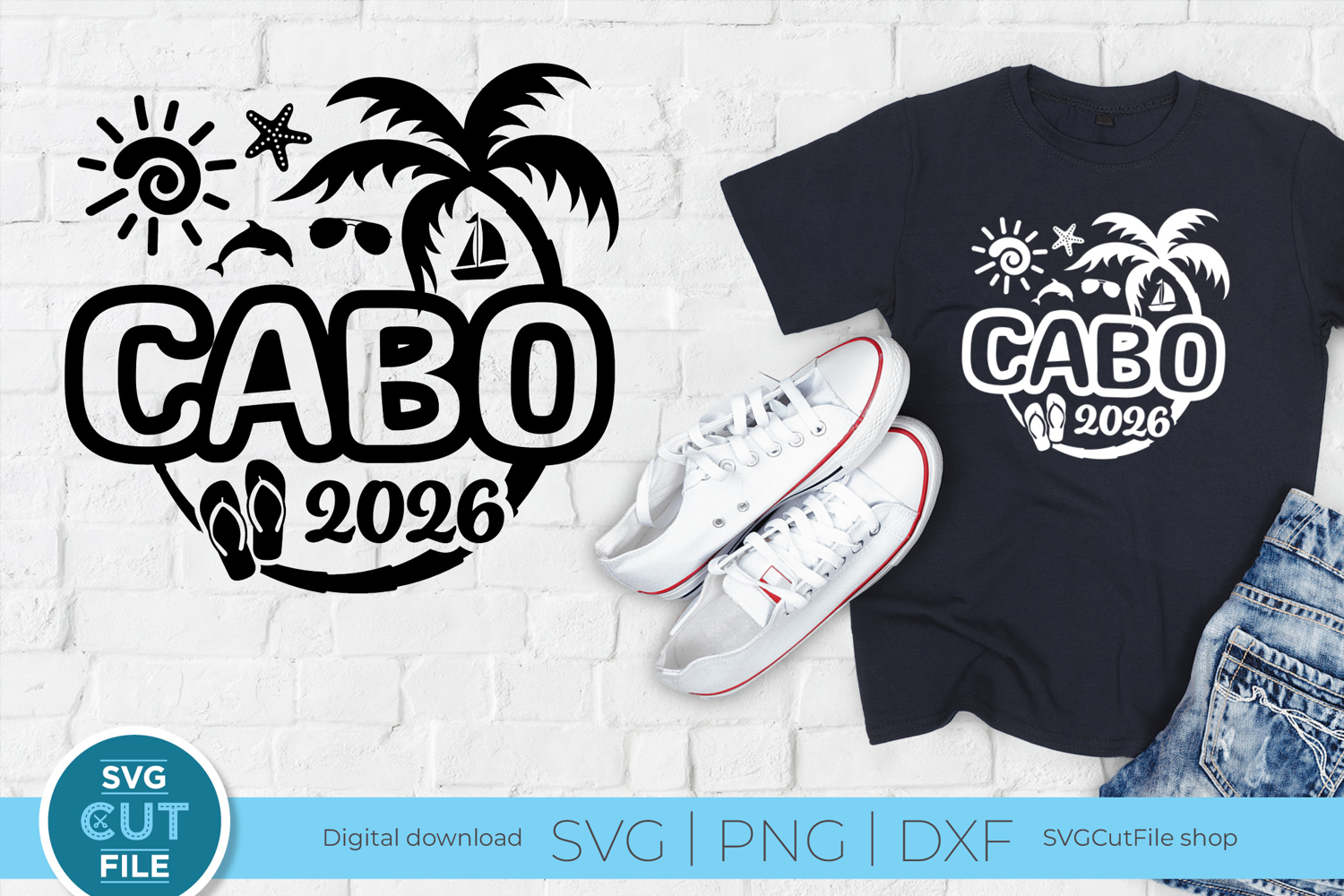 Instant Download: 2026 Cabo svg - Celebrate the beauty of Cabo, Mexico with this Cabo SVG design! Perfect for cutting or sublimation on shirts and tote bags, this design features iconic Cabo vacation elements like palm trees, flip flops, and ocean life.