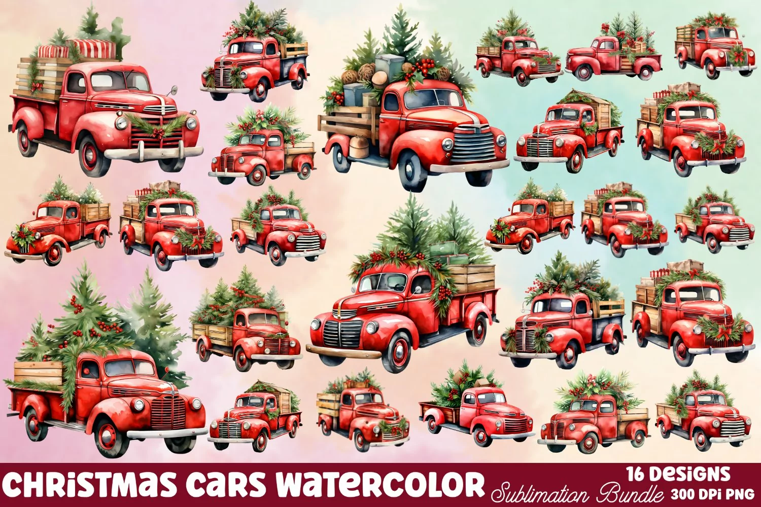 Similar Design Products to Christmas Cars Watercolor clipart Bundle, Christmas Bundle