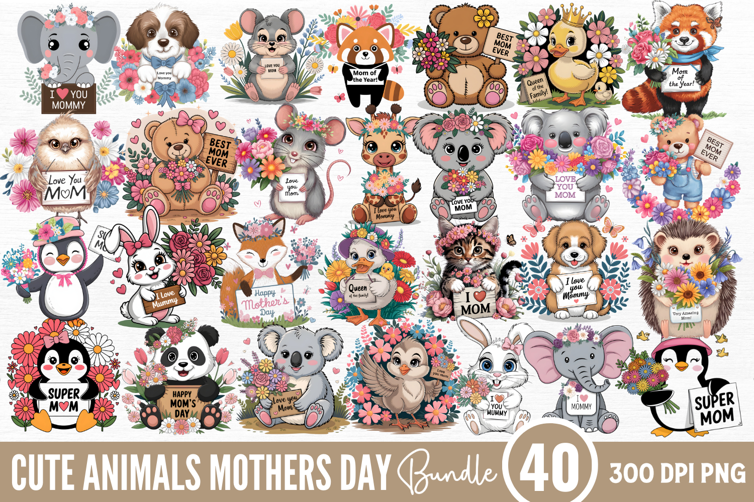 Cute Animals Mothers Day Clipart Bundle PNG