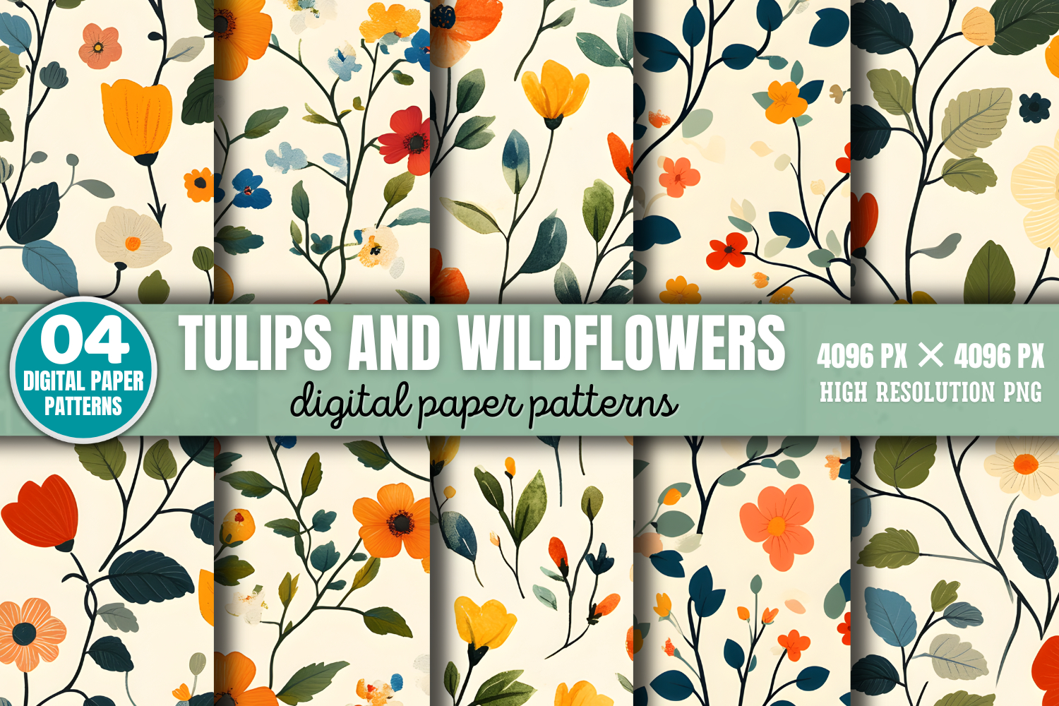 Similar Design Products to Tulips And Wildflowers Patterns Digital Paper Background PNG