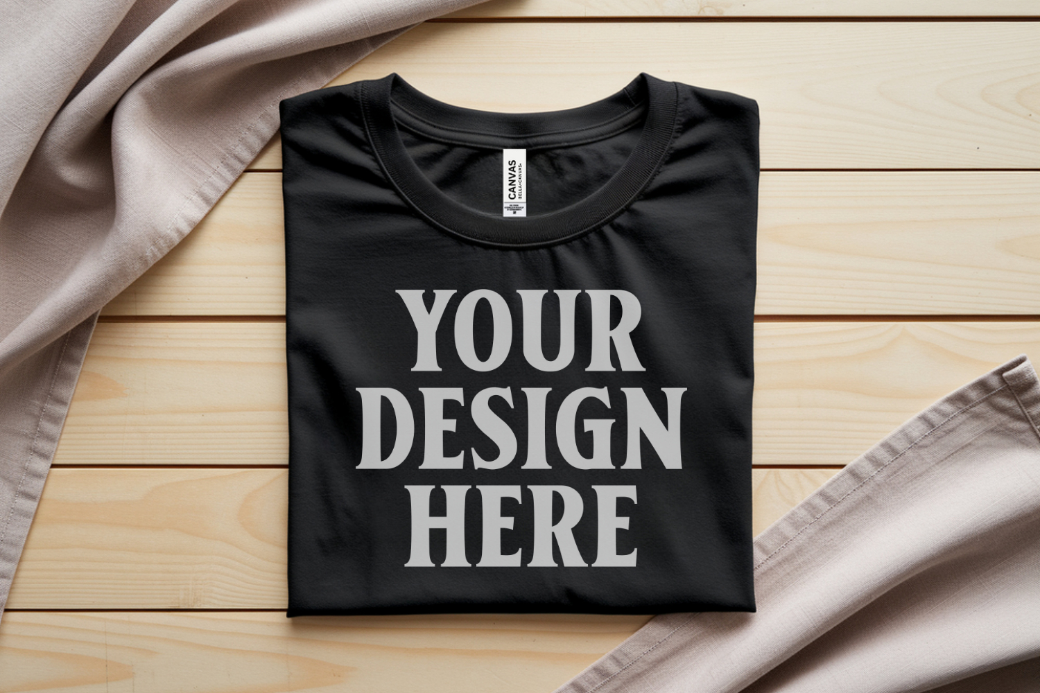 Black Folded Bella Canvas 3001 Flat Lay T-Shirt Mockup