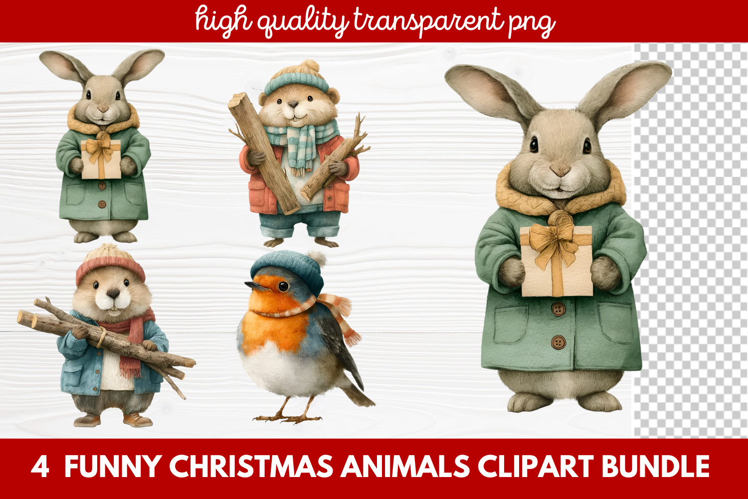 4 Funny Christmas Animals Clipart | Cute Holiday Animal PNG Set for Crafts & Digital Designs