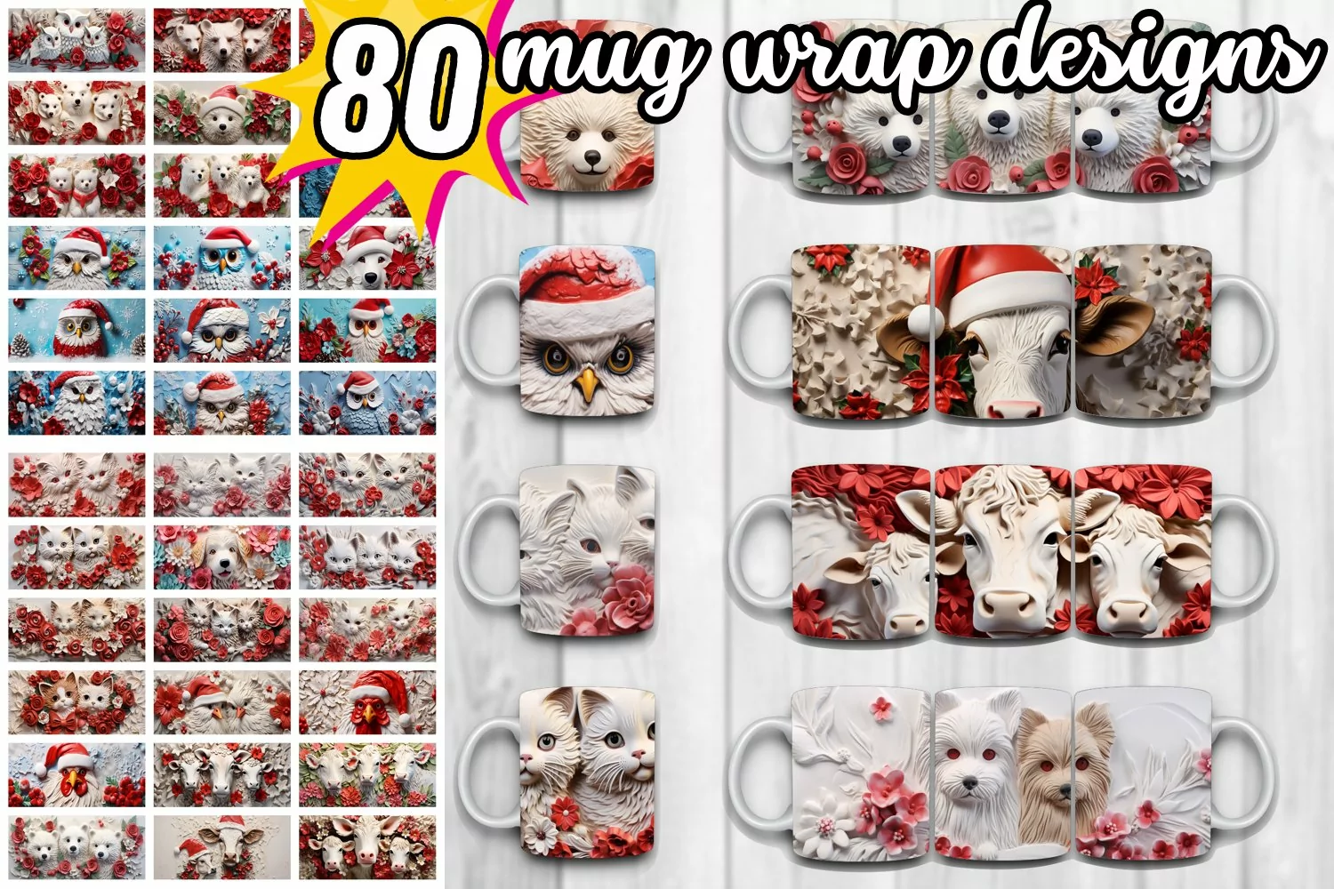 80 3D Christmas Mug Wrap Bundle, Cow PNG, Hole In Wall PNG