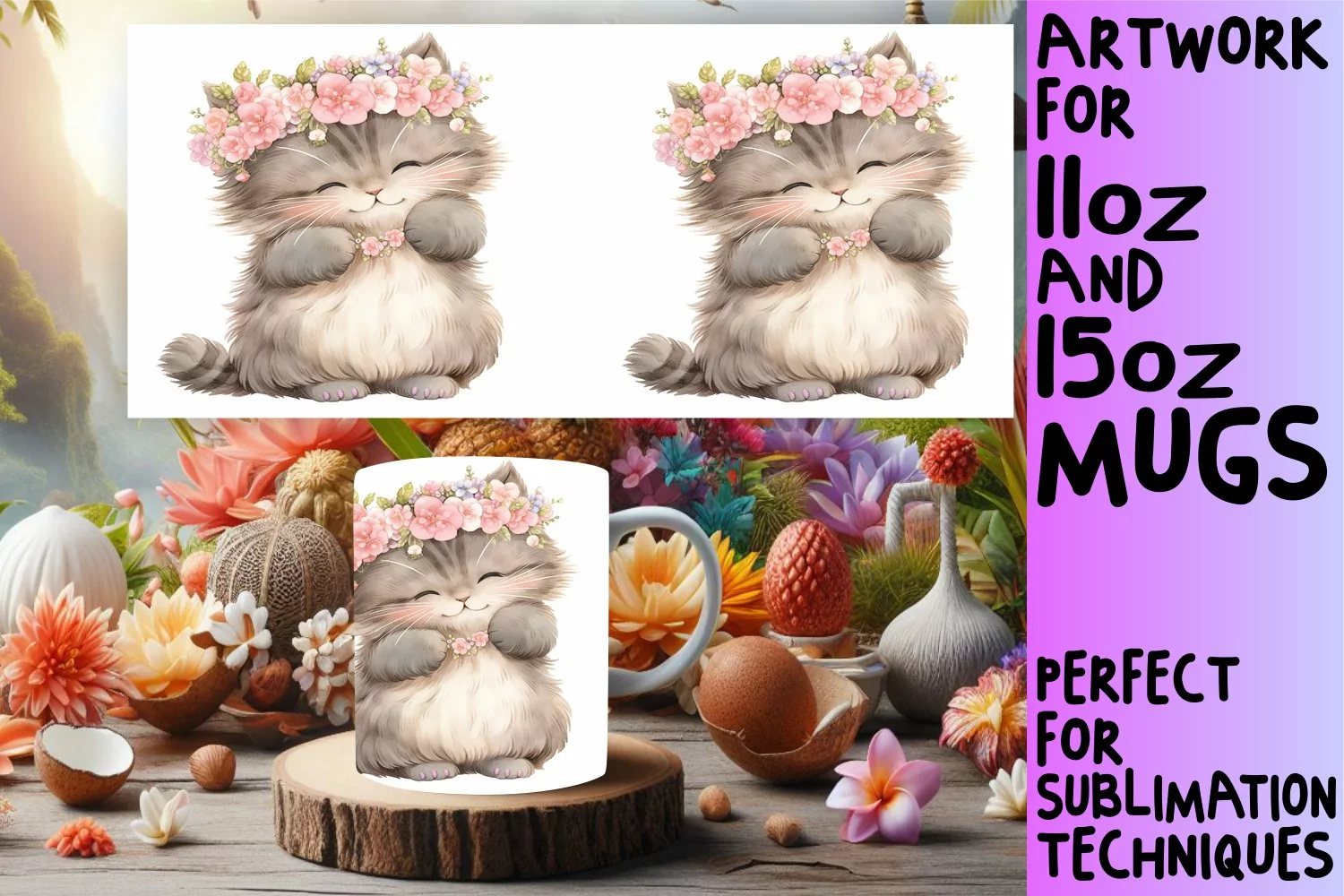 Whimsical Cat Watercolor Mug Wrap - Spring Design