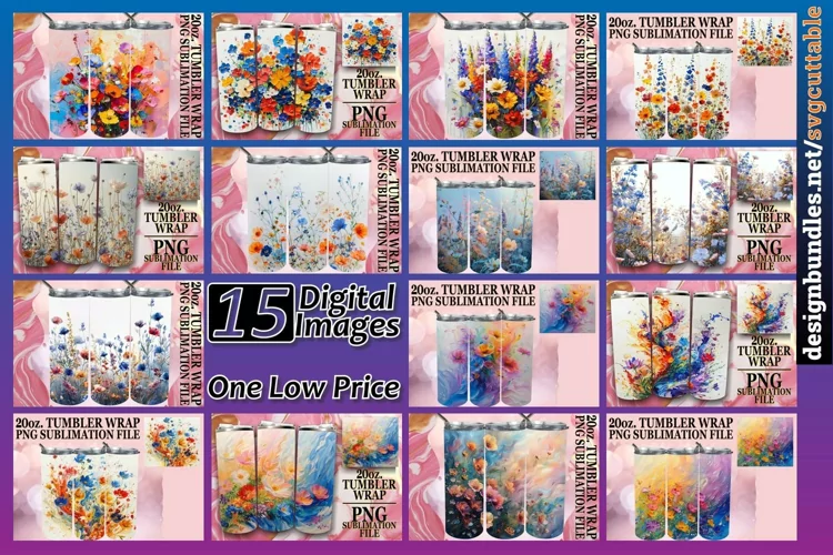 Similar Design Products to 15x Watercolor Tumbler Wrap Bundle PNG, Spring Flowers