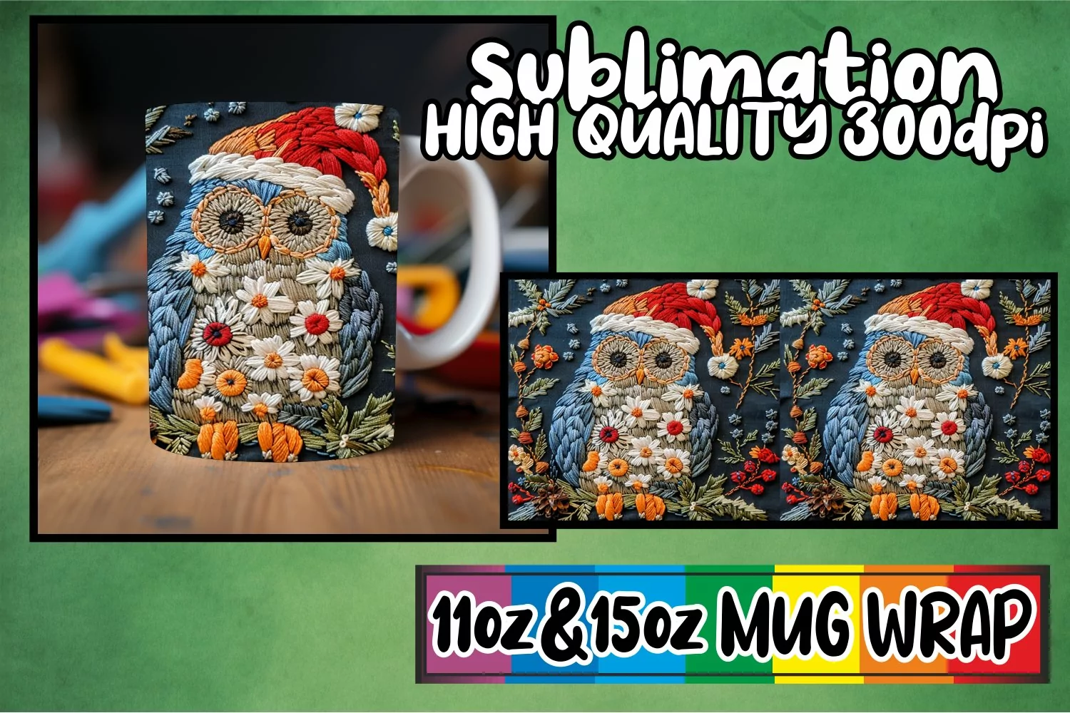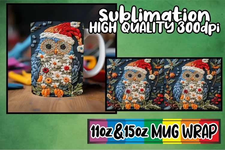 Embroidered Christmas Owl Wrap 11oz 15oz Mug Sublimation