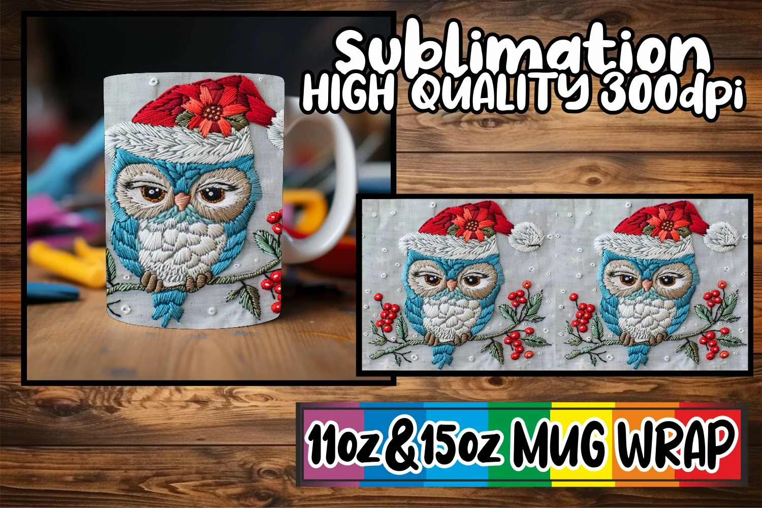 Similar Design Products to Owl Christmas Mug Wrap 11oz 15oz Embroidered Design