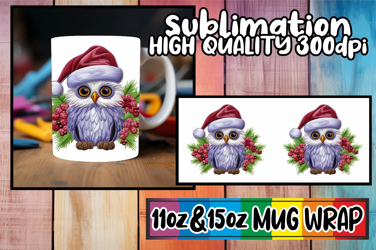 Christmas Owl Wrap for 11oz 15oz Mug Holiday Design